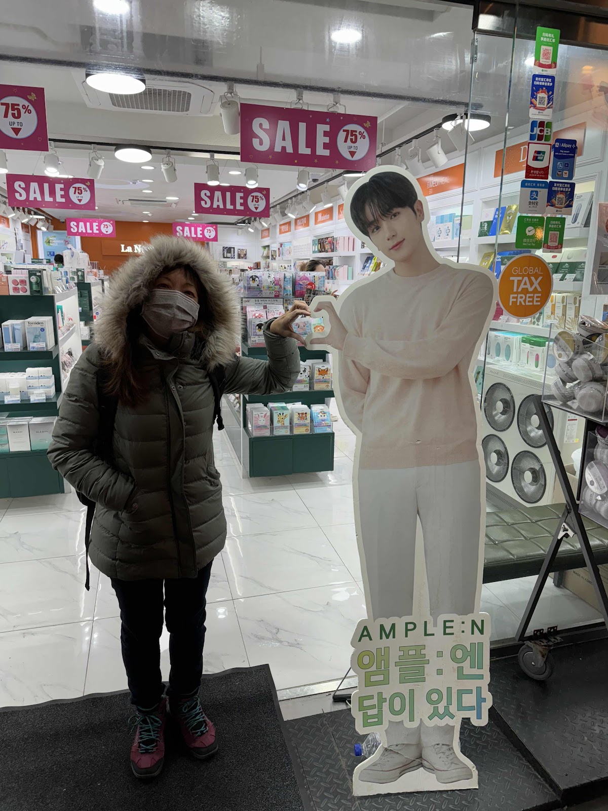 經過明洞的藥妝店外投放一個帥歐爸就是要女孩子去跟他一起比愛心拍照